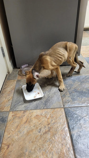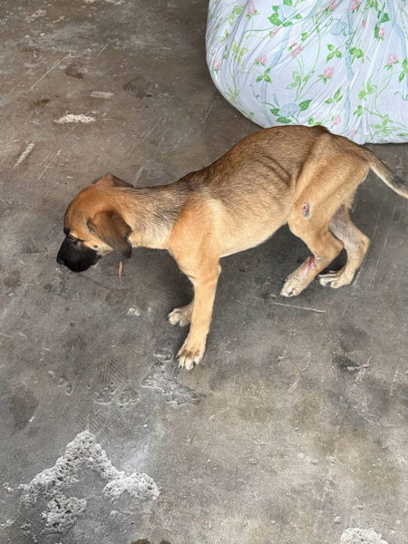 - His ribs are showing, but his belly is painfully bloated, likely from parasites.